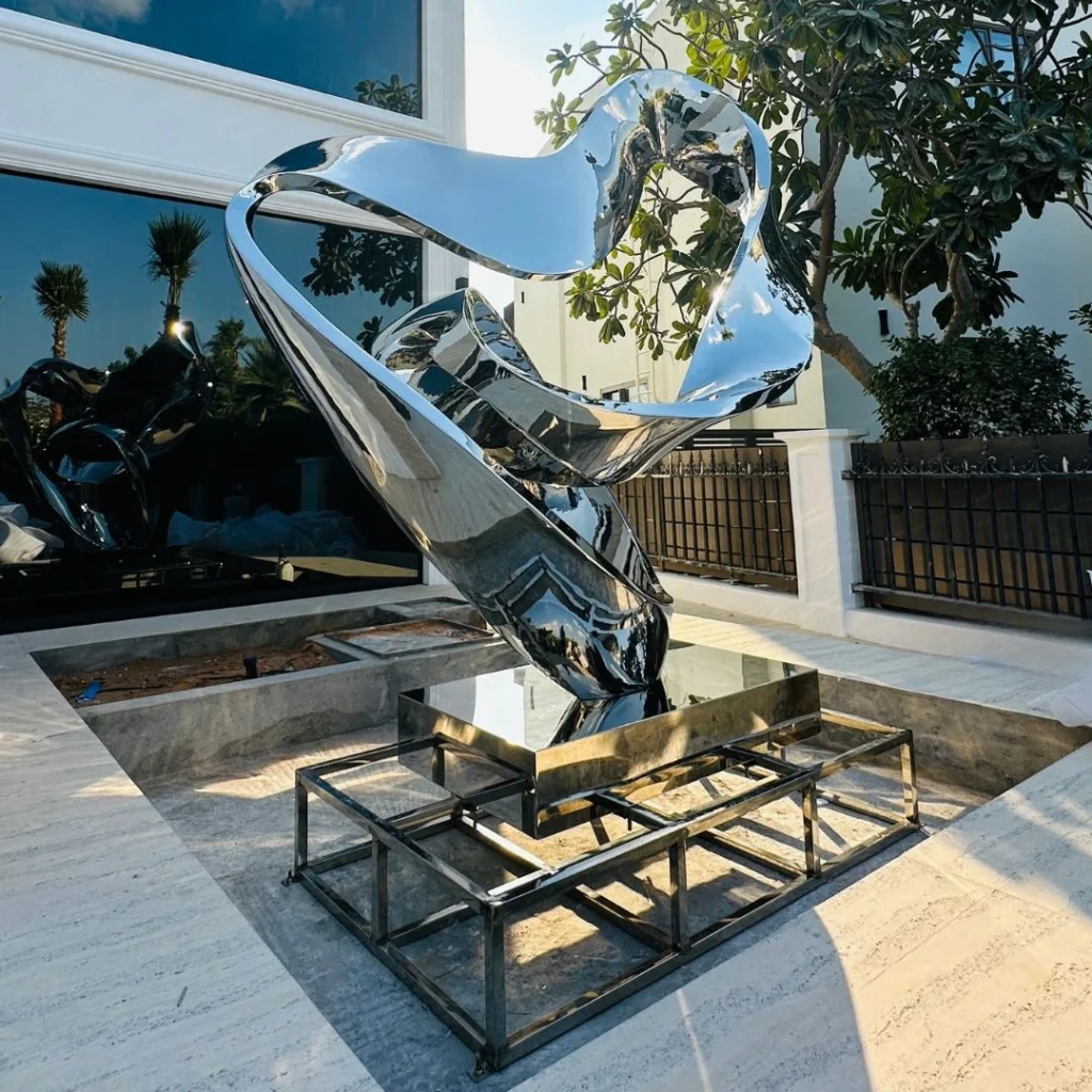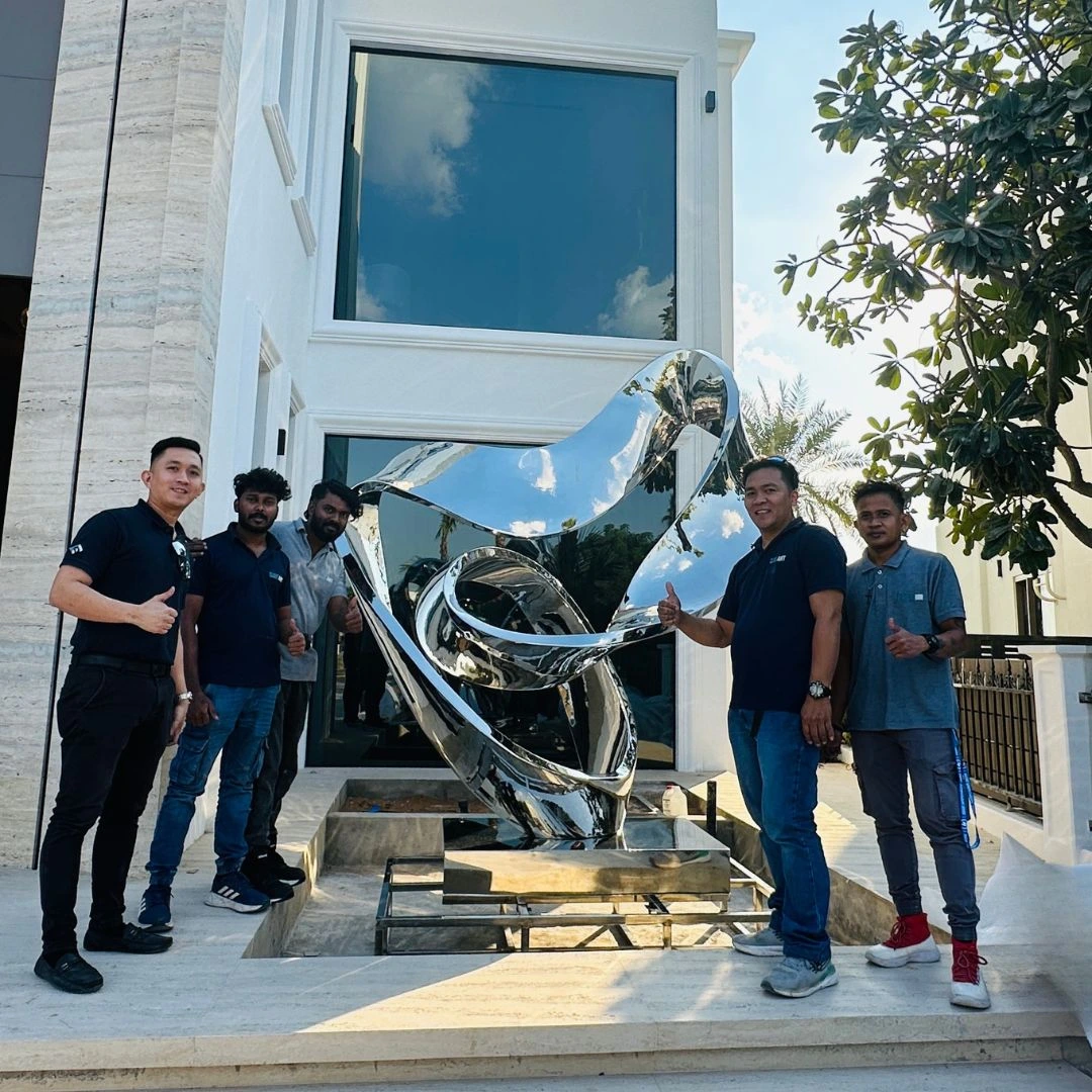 For a Luxury Villa at Jumeirah Island, Dubai, Qube Artis crafted a striking stainless steel sculpture that embodies the essence of contemporary luxury and artistic precision. Designed to complement the villa’s modern architecture, the sculpture reflects its surroundings through elegant mirrored surfaces — creating a captivating play of light, form, and reflection.